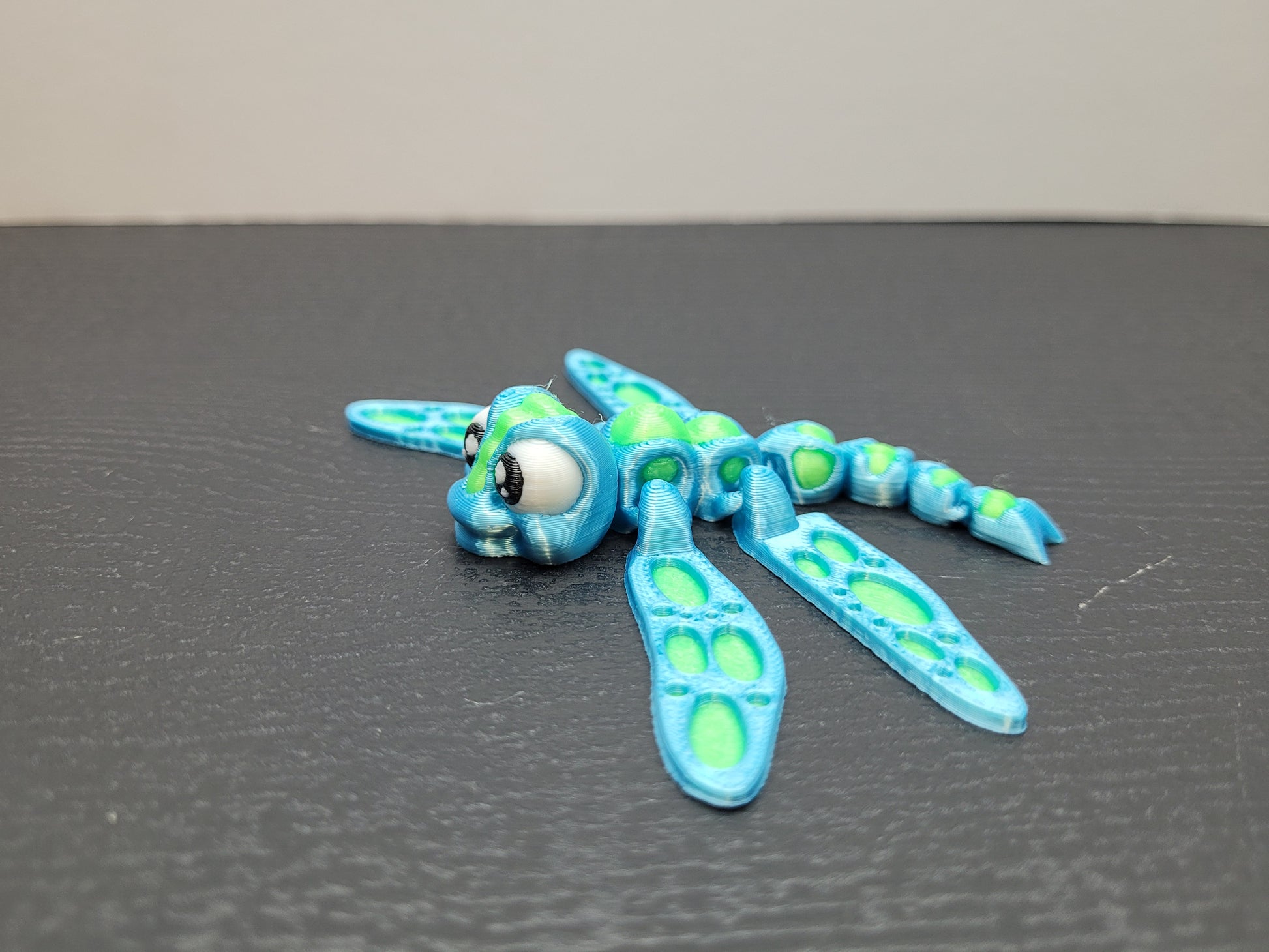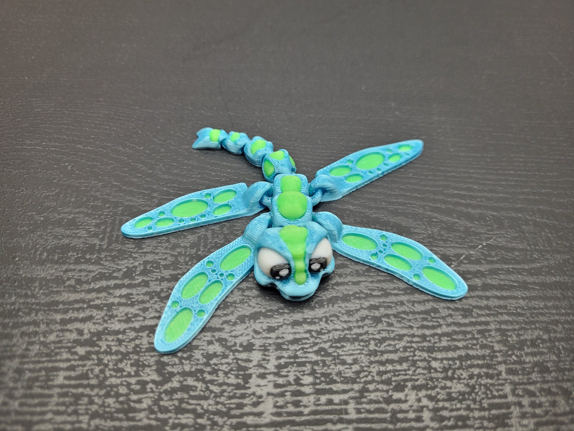 This delicate dragonfly wigglet has long articulated wings and a bendy tail that flutter and wiggle when you move it. It makes a relaxing fidget and a colorful little accent for your desk or shelf.